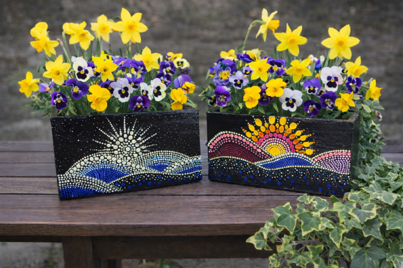 In this workshop you will be painting a wooden planter with instruction on dot style painting. You can choose your own design and choose between two planter boxes.
